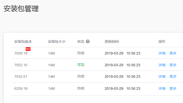 安装包一共有可见和隐藏两种状态,新的安装包默认隐藏,经过设置后变为可见。安装包被删除后将无法设置,如后期需要该版本安装包,请联系微收银运营人员,由运营人员再次推送至插件平台。