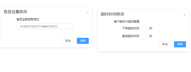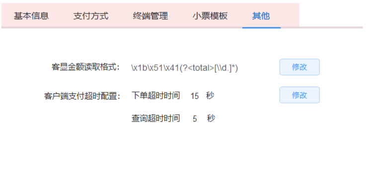本功能主要设置解析客显的正则格式和客户端支付超时时间。客显正则用于解析串口客显数据,如不设置或设置有误可能会导致客户端无法使用串口获取金额。支付超时时间是设置单笔交易的正常时间长度,超过该时间长度则将该笔订单归为未知订单状态。