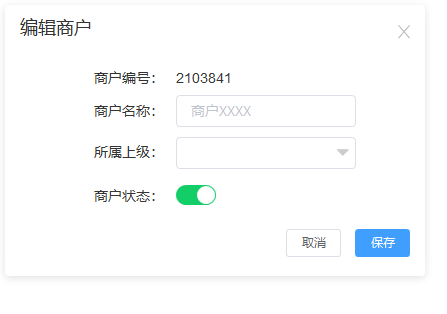 商户状态按钮默认开启,关闭后该商户会变成禁用状态。