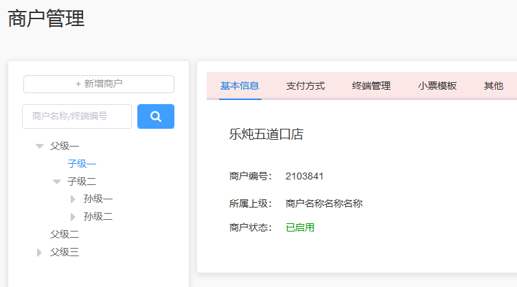 所有的商户都在本功能内,选择商户后,右侧会显示出该商户的基本信息。