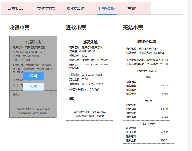 在这里我们可以设置客户端的收银小票、退款小票和班结小票的样式。