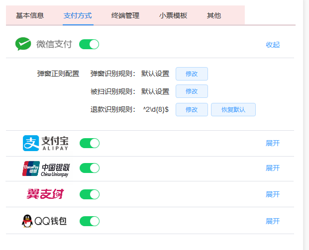 该功能控制了商户的可用支付途径。支付方式开关如果关闭,则商户无法选择该支付途径进行交易。