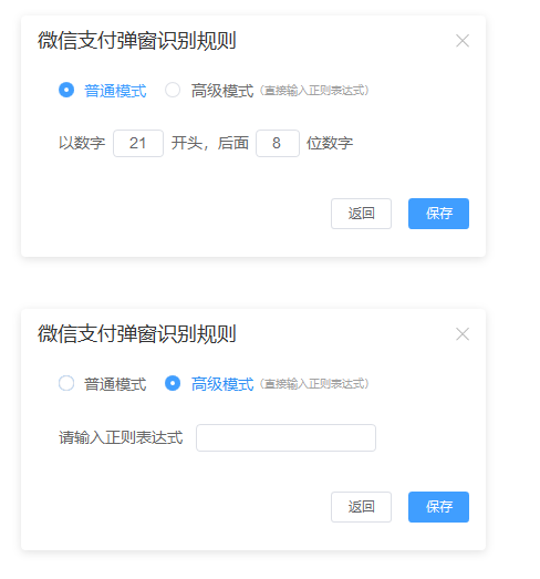 正则有“普通模式”和“高级模式”两种模式,普通模式需要定义付款码的开头数字和付款码位数。