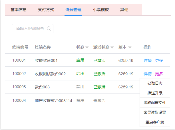 该功能控制商户所有的支付终端,包括在线升级、读取日志、读取配置文件、重启客户端等功能。