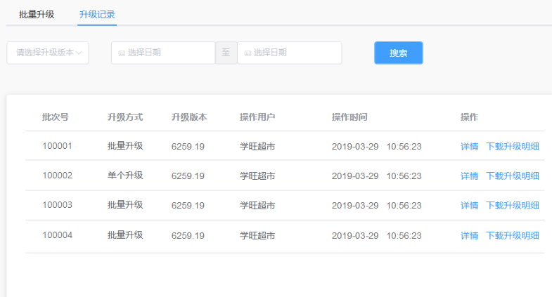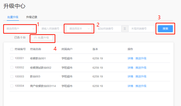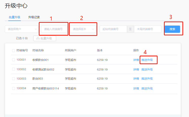 批量升级:先选择商户,在选择需要推送的版本,点击搜索后,下方列表会显示该商户所有的终端,全选后点击批量升级。