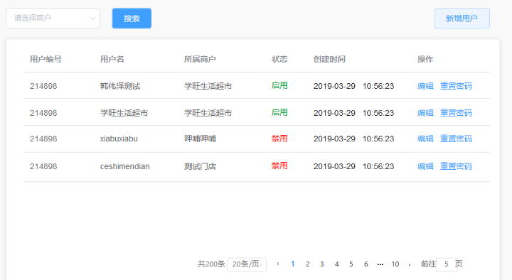该功能管理所有的账号,包括管理员账号和商户账号,我们可以在这里对任意账号进行修改,也可以新增或禁用账号。
